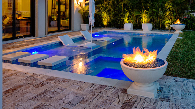 Dramatik gece yüzmeleri için yer altı havuzunuzun yanına bir ateş özelliği kurun . Hem sanatsal biçime hem de kullanışlı işleve hizmet eden bir dizi su içi taş basamakla havuzunuzu verandanıza veya güvertenize bağlayın.
